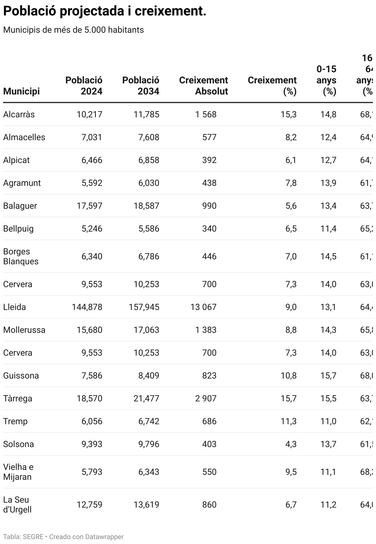 A nivell de municipis grans, Lleida augmentarà poc més de 13.000 habitants, arribant als 158.000 habitants. Mollerussa projecta un augment de 1.383 habitants, arribant als 17.063 residents el 2034, un increment del 8,8%. Balaguer creixerà més moderadament un 5,6% fins assolir els 18.587 habitants.
