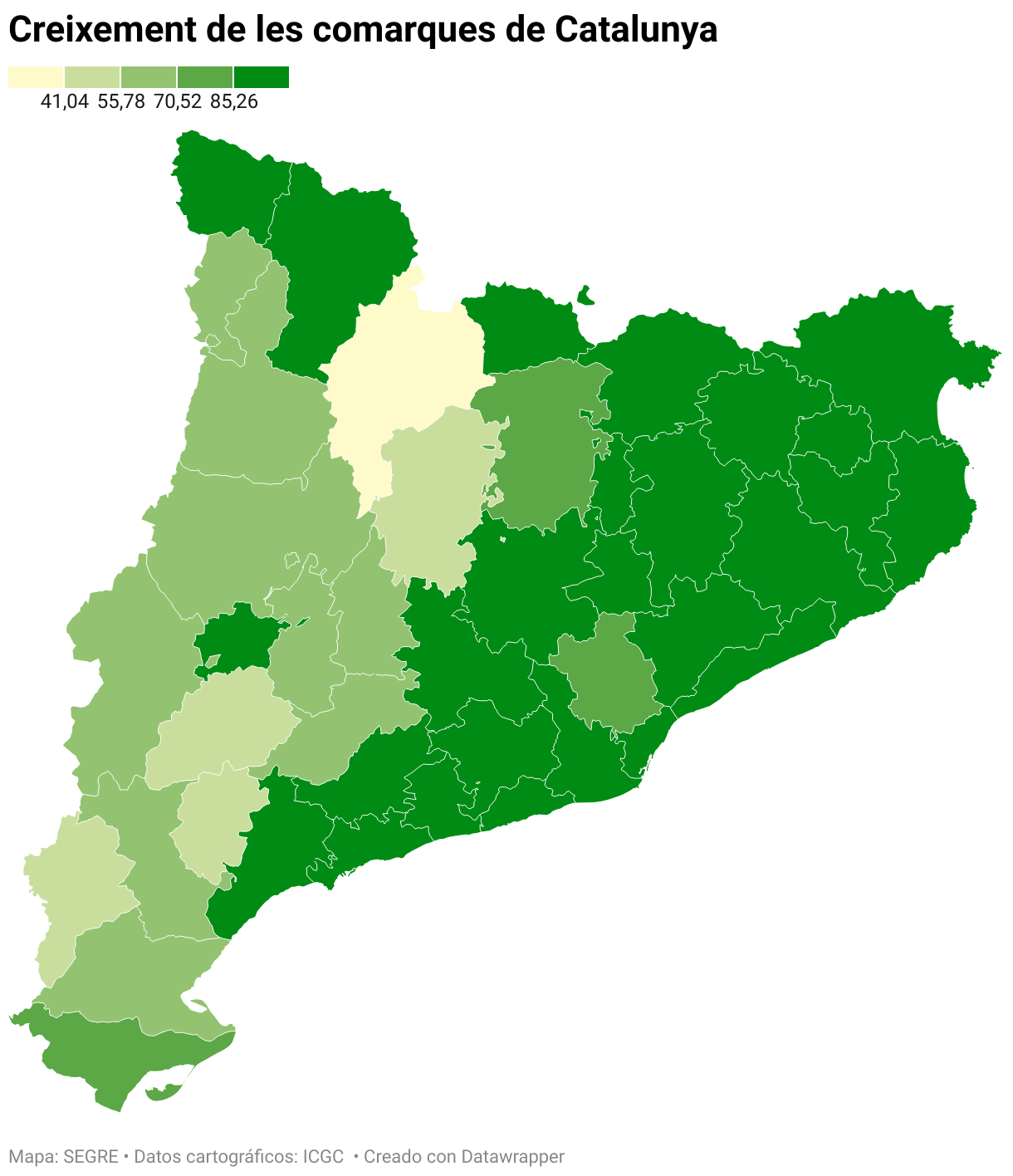 L'anàlisi comarcal mostra contrastos significatius al territori. Les comarques del Pla d'Urgell i el Pallars Sobirà presenten perspectives molt favorables, amb més del 93% dels seus municipis en creixement. L'Aran també destaca positivament amb un 88,9%, seguida de l'Urgell (70,0%) i la Segarra (68,4%). A l'extrem oposat, l'Alt Urgell només té un 26,3% de municipis amb projeccions positives, seguit de les Garrigues (54,2%) i el Solsonès (52,9%).