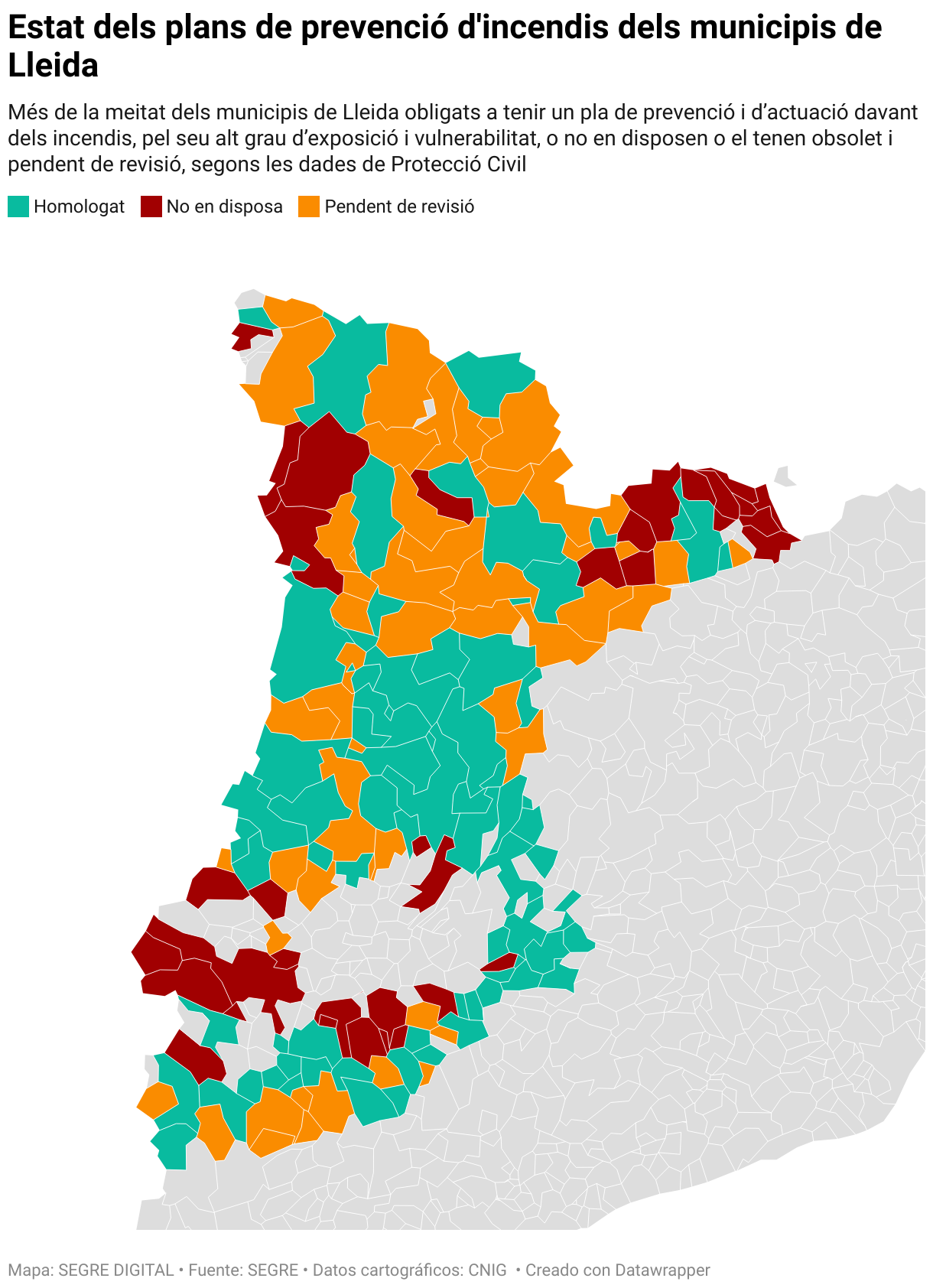 La mitad de los municipios de Lleida que están obligados a disponer de un plan de prevención y de actuación ante los incendios forestales por su elevado grado de vulnerabilidad a este tipo de incidentes, 81 de 148, o carecen de él (33) porque nunca han llegado a redactarlo o se les ha quedado obsoleto (48) y se encuentra pendiente de revisión. Los otros 67 (45,2%) tienen los papeles el regla.